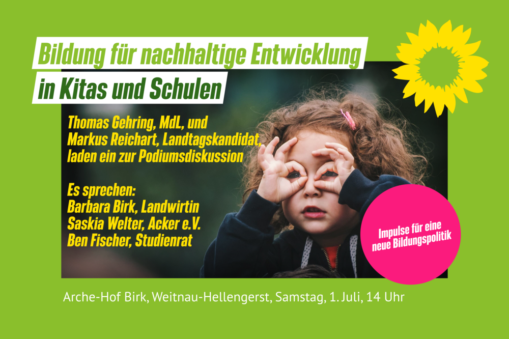Eine umfassende Bildung für nachhaltige Entwicklung berücksichtigt soziale, ökologische, politische sowie kulturelle Aspekte. Wie dies in Kitas und Schulen gelebt werden kann, diskutieren wir am Samstag, 1. Juli, um 14 Uhr auf dem Arche-Hof Birk in Weitnau-Hellengerst. Thomas Gehring und der Kemptener Landtagskandidat Markus Reichart laden zu Impulsvorträgen und moderieren die anschließende Diskussionsrunde.
