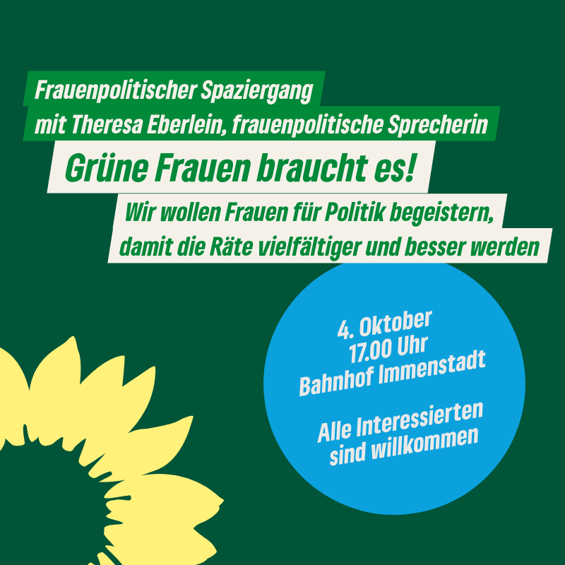 Wir haben Theresa Eberlein, die Frauenpolitische Sprecherin der Bayerischen Grünen und Stadträtin, bei uns im KV zu Gast und werden uns mit ihr auf den Weg machen, Frauen für Grünes Engagement zu begeistern. Dazu treffen wir uns am Freitag, 4. Oktober, um 17 Uhr am Bahnhof in Immenstadt. Wir begrüßen dort Theresa und nehmen sie mit auf einen Spaziergang durchs Städtle.