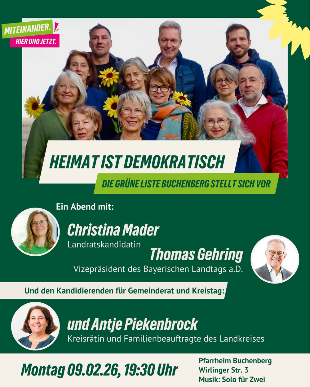 Neben den politischen Gästen stellen sich die 13 Kandidierenden der Offenen Grünen Liste Buchenberg für den Gemeinderat sowie für den Kreistag Oberallgäu vor, darunter Antje Piekenbrock, amtierende Kreisrätin und Familienbeauftragte des Landkreises.