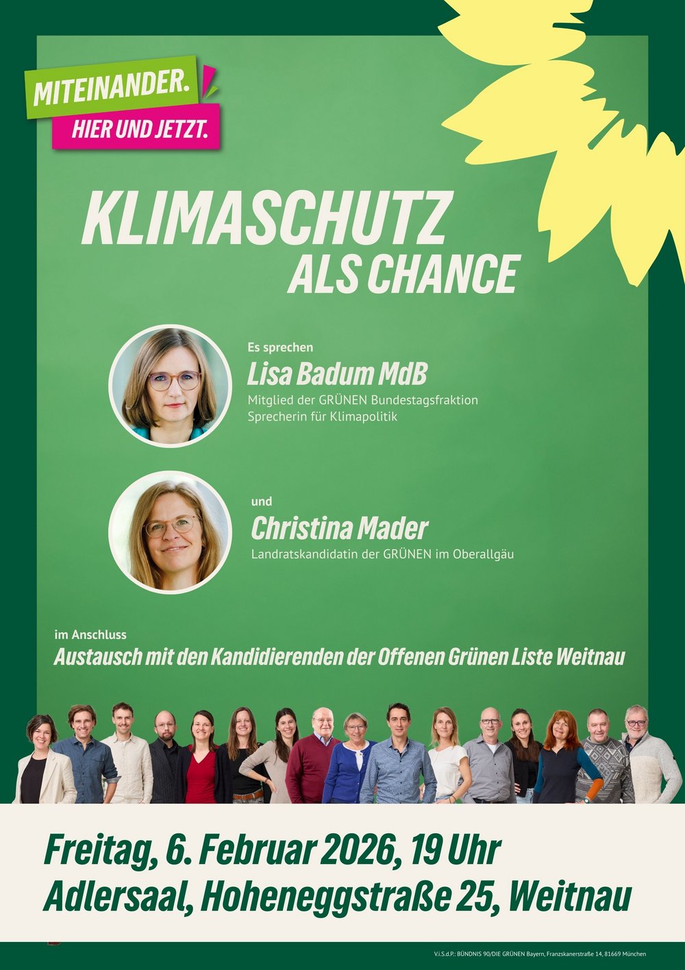 Am Freitag, 6. Februar 2026, veranstaltet die Offene Grüne Liste Weitnau ein Bürgergespräch zum Thema „Klimaschutz als Chance“. Die Veranstaltung findet im Adlersaal in Weitnau von 19 bis 21 Uhr statt und richtet sich an alle interessierten Bürgerinnen und Bürger.