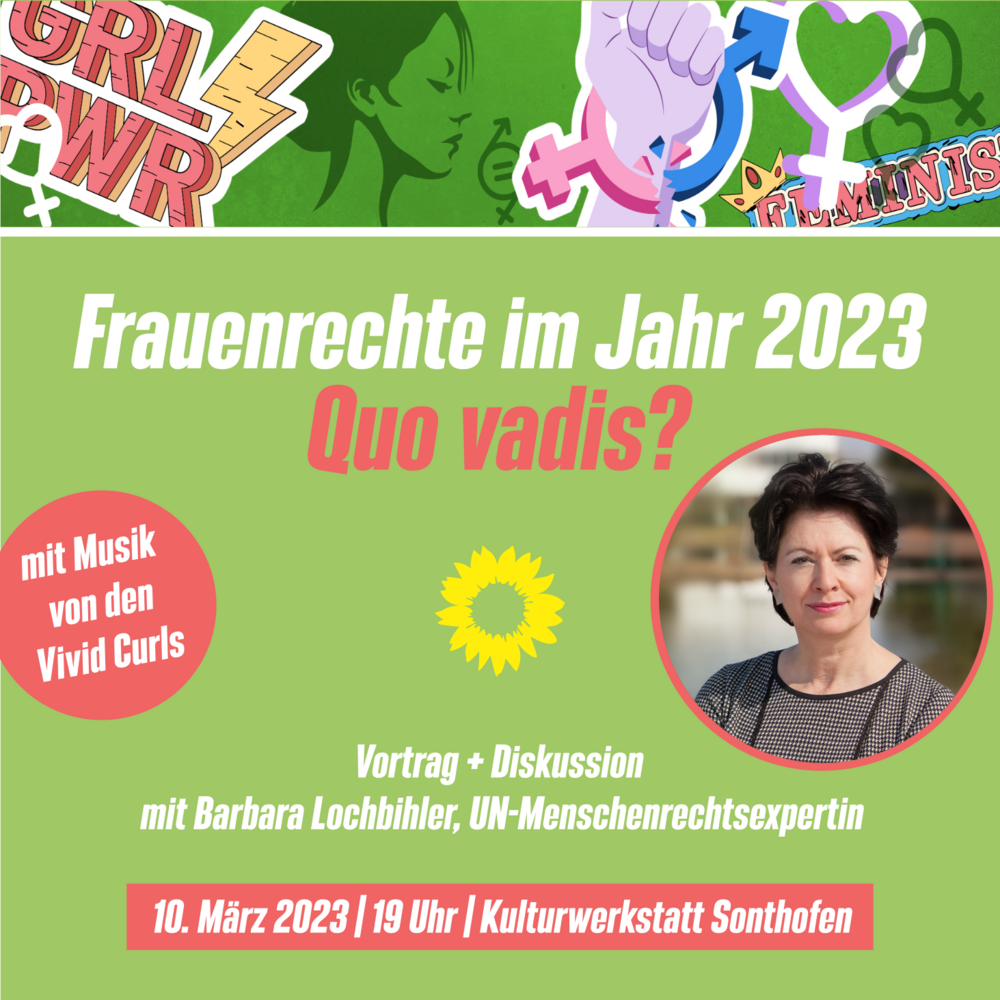 Unter dem Motto „Frauenrechte 2023- Quo Vadis?“ wird die Menschenrechtlerin Barbara Lochbihler auf das Thema Frauenrechte eingehen und anschließend mit den Besucher*innen diskutieren. Als Generalsekretärin der Internationalen Frauenliga für Frieden und Freiheit in Genf hat sie sich insbesondere für die Rechte von Frauen und Mädchen, gegen die Straflosigkeit schwerer Menschenrechtsverletzungen, für die Rechte von Migranten und Geflüchteten und für Gerechtigkeit für die Opfer von Menschenrechtsverletzungen weltweit eingesetzt. Mit ihrer langjährigen internationalen Erfahrung ist Lochbihler als Vizepräsidentin des UN-Ausschusses gegen das Verschwindenlassen von Menschen immer noch politisch aktiv. Der Abend und die Diskussion wird von der Vorsitzenden der Oberallgäuer Kreistagsfraktion Christina Mader moderiert. Für das musikalische Rahmenprogramm sorgen die Vivid Curls.