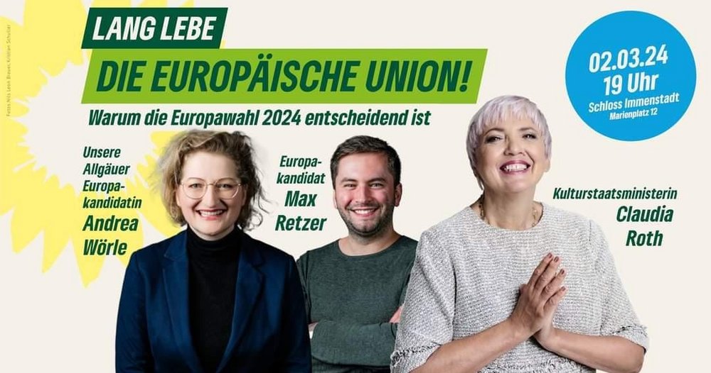 Am Samstag, dem 02. März 2024 um 19 Uhr findet eine Veranstaltung des Grünen Bezirksverbands Schwaben zur Europawahl im Schlosssaal in Immenstadt (Schloss Immenstadt, Marienplatz 12) statt. Wir sprechen über Europa und die Europäische Union als Bollwerk für Freiheit, Frieden und Demokratie mit: