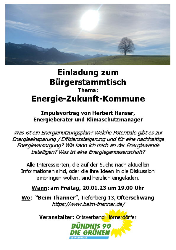 Mit dem Bautechniker und Energieberater Herbert Hanser konnten wir einen sehr kompetenten Referenten gewinnen, der sich seit vielen Jahren mit diesem Thema auseinandersetzt und derzeit als Klimamanager der Gemeinden Blaichach und Hindelang konkret Konzepte zu nachhaltiger Energieversorgung und Klimaschutz in der Kommune erarbeitet und umsetzt. Herr Hanser wird mit einem Impulsvortrag einen Überblick über die Thematik geben, möchte aber vor allem auch für eine anregende Diskussion zur Verfügung stehen.