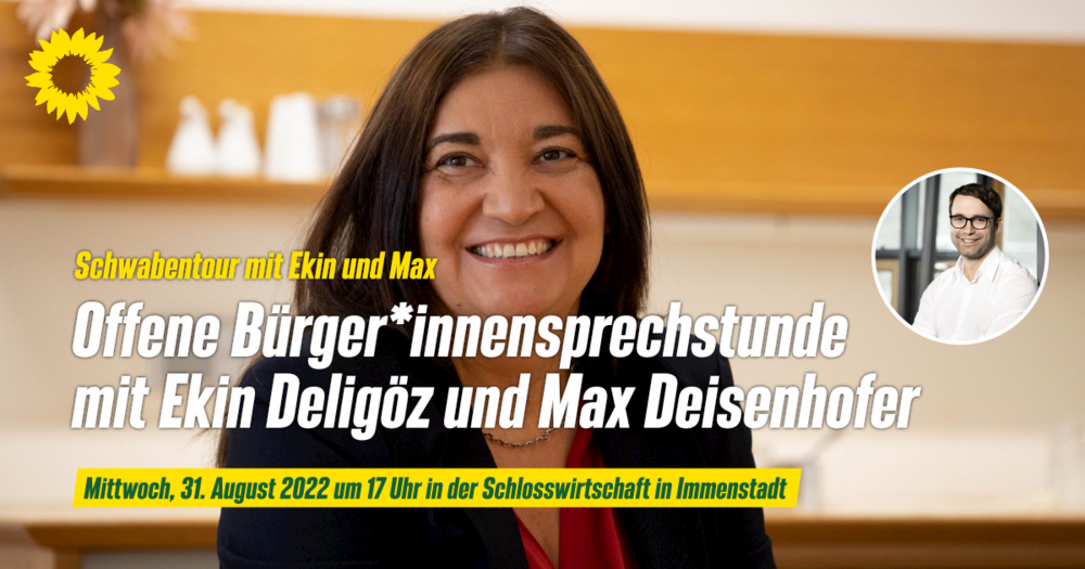 Am Mittwoch, 31. August ab 17 Uhr bietet Ekin Deligöz, Parlamentarische Staatssekretärin im Bundesministerium für Familie, Senioren, Frauen und Jugend in der Schlosswirtschaft in Immenstadt eine offene Sprechstunde für die Oberallgäuer Bevölkerung an. Außerdem mit dabei ist Landtagsabgeordneter Max Deisenhofer, der die landespolitischen Fragen beantworten wird.