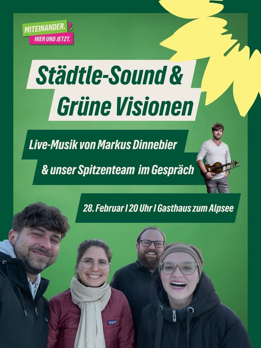 Unterstützt wird Dinnebier von den Spitzenkandidierenden der Immenstädter Grünen Liste Tina Thaqi, Jakob Schneider und Yelena Glajcar. Sie bereichern den Abend mit eigenen Impulsen zu gesellschaftlichen und ökologischen Themen. Auch die Grüne Landratskandidatin Christina Mader wird mitwirken und ihre Perspektiven auf eine nachhaltige Regionalpolitik einbringen.