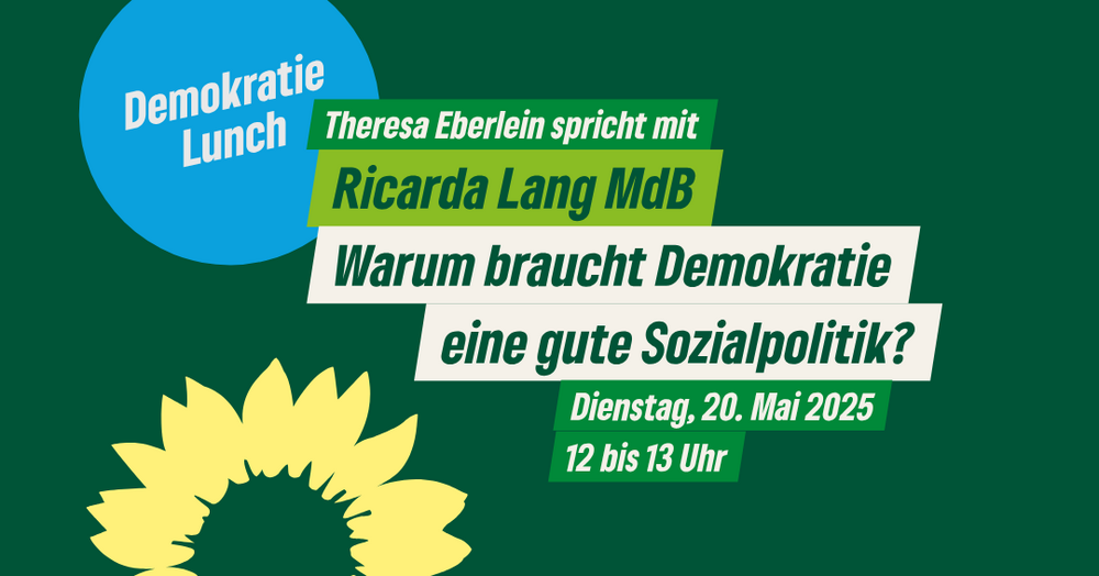 Das erste Treffen am 20. Mai um 12 Uhr steht ganz im Zeichen der Sozialpolitik. Bezahlbare Mieten, gerechte Bildungschancen, faire Löhne, auskömmliche Renten, Schutz bei Erwerbsausfall und verlässliche Betreuungsplätze, das und noch vieles mehr sind die Knackpunkte innerhalb einer guten Sozialpolitik. Diese Themen betreffen alle Menschen in Deutschland – und sie können Ängste schüren und Gerechtigkeitsdebatten befeuern. Hier gute Lösungen zu finden, gehört zu den größten innenpolitischen Herausforderungen der aktuellen Bundesregierung. Gemeinsam mit Ricarda Lang MdB spricht Theresa darüber, warum eine wehrhafte Demokratie auf einer guten Sozialpolitik aufbaut und wofür wir GRÜNE stehen.