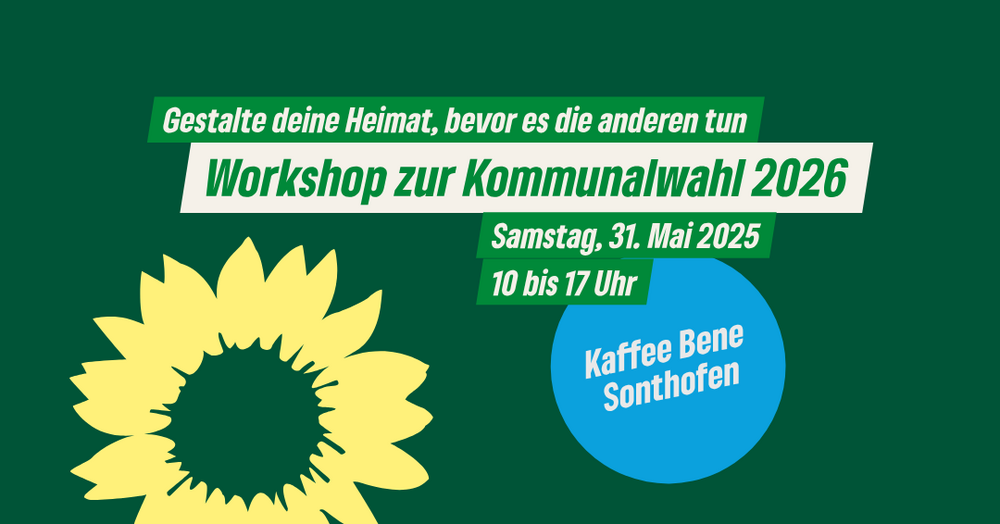 Wenn du deine Ideen für die Kommunalwahl 2026 einbringen möchtest, komm zu unserem Workshop mit Birgit Zipfel von der Landesgeschäftsstelle der GRÜNEN. Wir treffen uns im Kaffee Bene in Sonthofen am 31. Mai um 10 Uhr.
