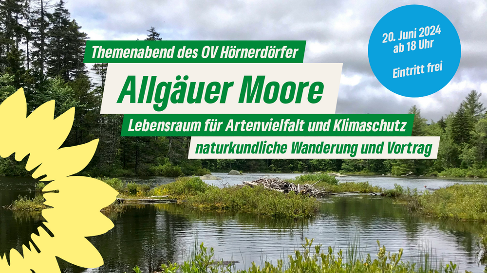 Unsere Moore sind Lebensraum für vielerlei Arten und gleichzeitige aktive Klimaschützer. Ihre entscheidende Rolle im Wasserkreislauf nimmt unser Ortsverband Hörnerdörfer in den Fokus. Zum Themenabend am Donnerstag, 20. Juni 2024, lädt er Interessierte herzlich ein. Das Programm sieht zunächst eine naturkundliche Führung durch das Tiefenberger Moor mit Florian Hintermeier vor. Gestartet wird um 18 Uhr am Wanderparkplatz Tiefenberg. Im Anschluss referiert Julia Wehnert (BUND Naturschutz) über die Entstehung der Allgäuer Moore, deren Nutzungsgeschichte und die Chancen, die ihr gezielter Schutz bietet. Der Vortrag beginnt um 19.30 Uhr im Gasthof „Beim Thanner“ in Ofterschwang-Tiefenberg. Es gibt Brotzeit und Getränke. Der Eintritt zu beiden Programmpunkten ist frei.