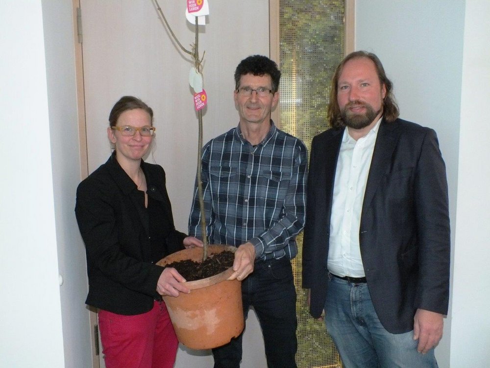 Immenstadt – Landratskandidatin Christina Mader und der Fraktionsvorsitzende der Grünen im Deutschen Bundestag Toni Hofreiter überreichten bei ihrem Besuch im Grünen Zentrum dem Immenstädter Stadtförster Gerald Honold (Bildmitte) ein Bergahorn für den Stadtwald. Zuvor informierten sie sich zusammen mit dem Landtagsvizepräsidenten Thomas Gehring über die Bergwaldoffensive und über den Zustand des Bergwaldes in Zeiten des Klimawandels. Die Bergwaldoffensiv gibt es seit 2008 und hat in dieser Zeit 80 Hektar mit 200.000 neuen Bäumen bepflanzt“, erläuterte Dr. Ulrich Sauter, Bereichsleiter Forst des Amtes für Landwirtschaft und Forsten.