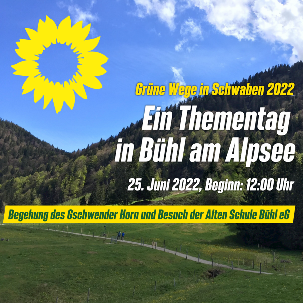Am Samstag, dem 25. Juni 2022 findet unser Thementag in Bühl am Alpsee statt, als Teil der vom Grünen Bezirksvorstand Schwaben initiierten Veranstaltungsreihe „Grüne Wege in Schwaben“.