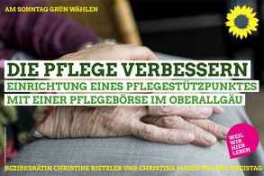 in Pflegestützpunkt im Oberallgäu soll eine umfassende, flächendeckende und bürgernahe Beratung für alle verbessern, so Kreisrätin und Pflegebeauftragte für den Bezirk Schwaben Christine Rietzler. Beim Förderprogramm des Sozialministeriums sind inzwischen Rahmenbedingungen sowie Förderung geklärt, sodass die Sozialverwaltung des Landkreises den entsprechenden Antrag stellen soll. Wichtig ist den Grünen auch, dass bei der Errichtung eines Pflegestützpunktes darauf geachtet wird, Doppelstrukturen zu vermeiden und alle bisher tätigen Akteure mit einbezogen werden. "Deshalb stehen in einem solchen Stützpunkt Vertretungen der Krankenkassen, der Kommunen, der Träger der freien Wohlfahrtsverbände, der Arbeitsvermittlung sowie der Patienten- und Angehörigenvereinigungen für Informationen zur Verfügung, und zwar kostenlos", betont Rietzler. Darüber hinaus regen die Grünen an, hier zugleich eine Pflegebörse für Fachkräfte bzw. für Kurzzeitpflegeplätze zu installieren. Das Ministerium plant mit bis zu 60 Pflegestützpunkten in Bayern, es gibt erst acht, und in Schwaben keinen, so Landratskandidatin Christina Mader: "Höchste Zeit zu handeln bei diesem zentralen Thema!"