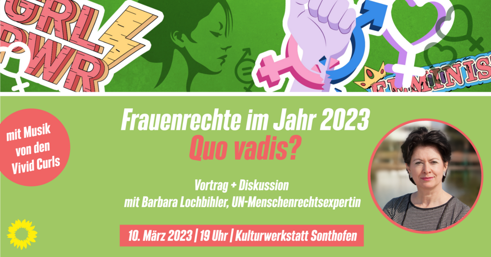 Unter dem Motto „Frauenrechte 2023- Quo Vadis?“ wird die Menschenrechtlerin Barbara Lochbihler auf das Thema Frauenrechte eingehen und anschließend mit den Besucher*innen diskutieren. Als Generalsekretärin der Internationalen Frauenliga für Frieden und Freiheit in Genf hat sie sich insbesondere für die Rechte von Frauen und Mädchen, gegen die Straflosigkeit schwerer Menschenrechtsverletzungen, für die Rechte von Migranten und Geflüchteten und für Gerechtigkeit für die Opfer von Menschenrechtsverletzungen weltweit eingesetzt. Mit ihrer langjährigen internationalen Erfahrung ist Lochbihler als Vizepräsidentin des UN-Ausschusses gegen das Verschwindenlassen von Menschen immer noch politisch aktiv. Der Abend und die Diskussion wird von der Vorsitzenden der Oberallgäuer Kreistagsfraktion Christina Mader moderiert. Für das musikalische Rahmenprogramm sorgen die Vivid Curls.