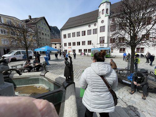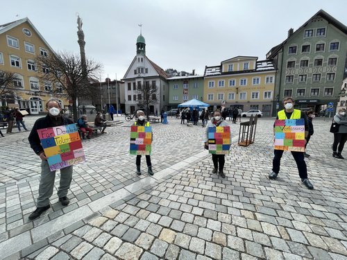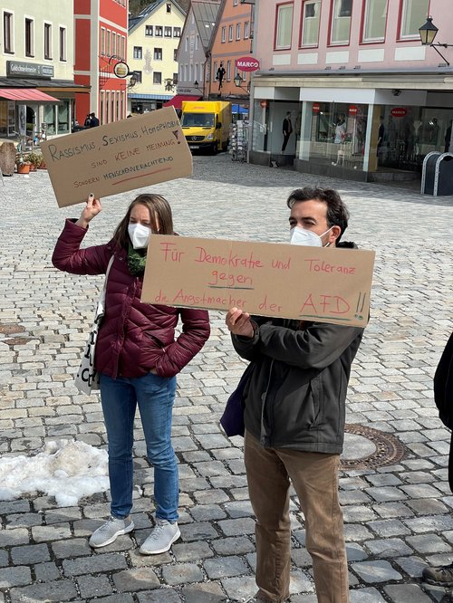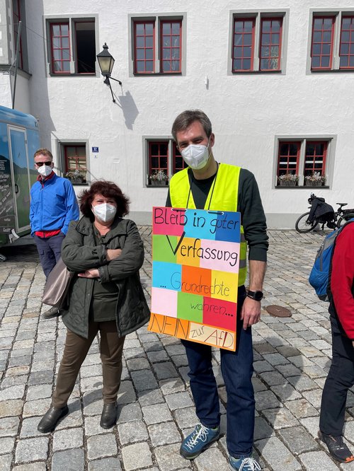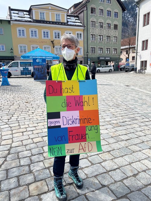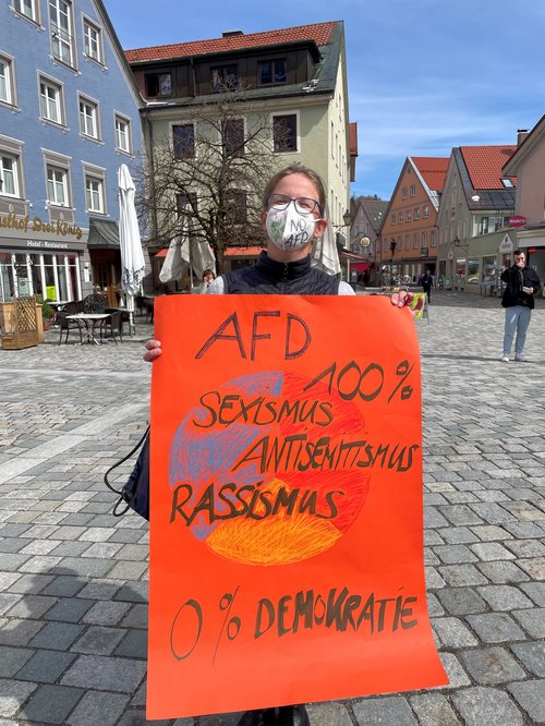 Das war das Motto unserer grünen Demo gegen das sog. „Bürgermobil“ der AfD, das am 9. April von 11.30 bis 13.30 am Marienplatz Halt machte. Zunächst musste man beobachten, wie sich zu Beginn sechs „Securityleute“, die ebenfalls von der AfD waren, am Marienplatz postierten. Zu dieser vollkommen unnötigen Drohkulisse gesellte sich dann das Bürgermobil der AfD dazu. Das Frauenbild der AfD wurde gleich am Anfang klar sichtbar, als eine Dame Stehtische und Sonnenschirm mehr oder weniger alleine aufbauen durfte, während die Herren meist tatenlos herumstanden und zuschauten. Wir Grüne postierten uns in gebührendem Abstand von der Veranstaltung und machten mit den von Rosi, Tina und von vielen anderen toll gestalteten Plakaten klar, dass wir nichts von der AfD und ihren „Inhalten“ halten, und zwar weder von ihrem Frauenbild noch von ihrem Rassismus noch von ihrem verqueren Verständnis von Demokratie. Wir trugen alle Masken, was man von den Damen und Herren der AfD anfangs nicht behaupten konnte. Erst nach einem freundlichen Hinweis der örtlichen Polizei kam man dann auch von AfD-Seite der Vorgabe, Maske zu tragen, nach. Die ganze AfD-Veranstaltung muss erfreulicherweise als ein vollkommener Misserfolg gewertet werden, weil der Stand in zwei Stunden so gut wie gar nicht frequentiert wurde. Auch der anwesende Landtagsabgeordnete der AfD hüllte sich durchgehend in Schweigen, was ebenfalls äußerst erfreulich war. Unter dem Strich bleibt vor allem klar hervorzuheben, dass wir bei der Gegendemo mindestens viermal so viele Teilnehmerinnen und Teilnehmer waren wie bei der AfD.