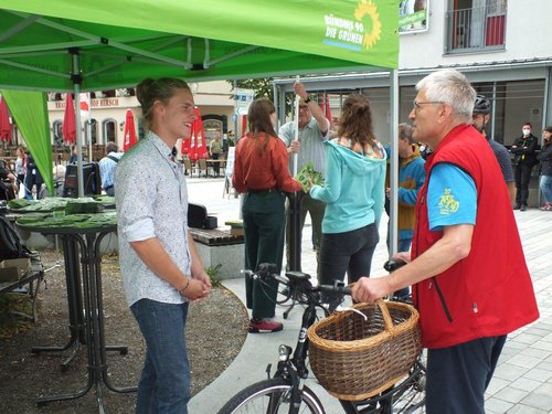 Zwei Themen, die vor allem auch im Allgäu von großer Bedeutung sind, strich Bandte besonders heraus: Die Landwirtschaft und den Waldumbau. Der 23-jährige Zimmerer und Baumpfleger möchte mit seiner Kandidatur und als Abgeordneter „seinen Teil zum Umbau zu einer sozial-ökologischen Gesellschaft beitragen“. Er sieht sich als junger Handwerker zwei Gruppen zugehörig, die bis jetzt im Bundestag kaum vertreten sind und zu wenig Gehör finden. „Es ist wichtig, dass meine Generation im Bundestag eine Stimme bekommt“, so Bandte. Die grundsätzliche Frage für ihn: „Wollen wir so weiter machen wie bisher oder wollen wir die Zukunft aktiv gestalten“ Bandte wird auch von der Grünen Jugend Schwaben unterstützt. Beide Redner verwiesen auf die Auswirkungen des Klimawandels mit Unwettern und Hochwasser, die auch das Allgäu getroffen haben.