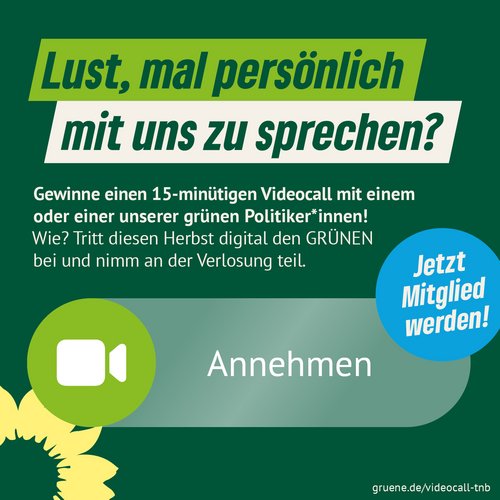 Für alle, die im Herbst 2023 digital Mitglied bei uns werden, haben wir etwas ganz Besonderes: Der Bundesverband verlost einen 15-minütigen Videocall mit grünen Politiker*innen. Du hast die Chance, mit Annalena oder Robert, Claudia oder Cem, Ricarda oder Omid in einem 15-minütigen Videocall über das zu sprechen, was dich beschäftigt – oder einfach locker zu quatschen. Mach mit!