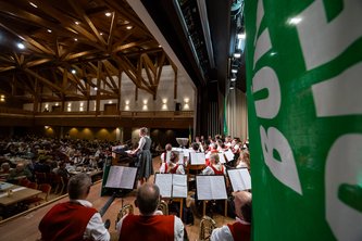 Unter viel Applaus betraten abschließend alle RednerInnen und die Ehrengäste gemeinsam die Bühne: Bürgermeister Bruno Sauter lud sie dazu ein, sich ins Goldene Buch der Gemeinde Fischen einzutragen.