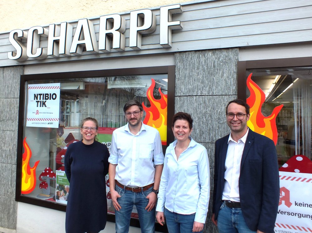 Der Landtagsabgeordnete der Grünen Max Deisenhofer besuchte zusammen mit der Vorsitzenden der Kreistagsfraktion Christina Mader die Scharpf-Apotheke in Sonthofen. Die beiden Inhaber Franziska Scharpf - Vizepräsidentin der Bayerischen Landesapothekenkammer - und ihr Bruder Christian informierten die Besucher über die Impfmöglichkeiten in Apotheken, den aktuellen Medikamentenmangel und ihre pharmazeutischen Dienstleistungen.