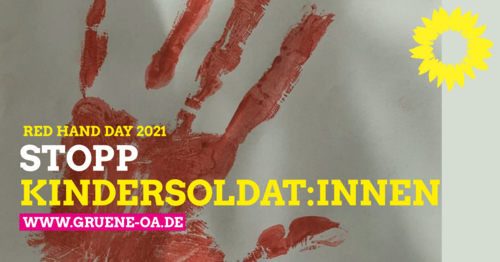 Anlässlich des internationalen Red Hand Days am 12. Februar rufen die Sprecherin des Kreisverbands Oberallgäu Carolin Schenk und die Kreistagsfraktionsvorsitzende Christina Mader dazu auf, ein deutliches Zeichen gegen den Einsatz von Kindersoldat*innen zu setzen. Gemeinsam mit Pius Bandte, Spitzenkandidat der Grüne Jugend im Bundestagswahlkampf, fordern sie: „Waffen gehören nicht in Kinderhände. UNICEF schätzt, dass immer noch zirka 250.000 Kindersoldat*innen weltweit zum Dienst an der Waffe gezwungen werden. In Ländern wie Burma, Kolumbien, Philippinen, Afghanistan und Kongo ist der Einsatz von Kindern und Jugendlichen in Krisengebieten traurige Realität. Auch bei den aktuellen Konflikten z.B. im Südsudan, in der Zentralafrikanischen Republik, in der Demokratischen Republik Kongo, in Somalia, in Syrien und im Jemen befürchten wir, dass Kindersoldatinnen zum Einsatz kommen. Sie werden ausgebeutet, häufig sexuell missbraucht oder eben direkt zum Kampf und Töten gezwungen. Die Jugendlichen sind nach diesen furchtbaren Erfahrungen schwer traumatisiert. Deshalb fordern wir, dass die Bundesregierung Druck auf Staaten ausübt, die das zusätzliche Abkommen zur Kinderrechtskonvention zwar unterzeichnet haben, sich faktisch aber nicht daranhalten. Dieses Abkommen verbietet den Einsatz von Minderjährigen in Kriegen. Wir fordern deshalb: Stoppt den Wahnsinn – keine Waffen in Kinderhände. Wir fordern Bildung statt Ausbeutung. Und das weltweit. Die Kindersoldat*innen verbringen Jahre ihres Lebens im Kriegsdienst, können weder zur Schule gehen noch eine Ausbildung machen und deshalb später nur schwer Fuß fassen. Auch Deutschland muss hier seiner Verantwortung als reiche Nation gerecht werden und mithelfen, diesen Kindern eine faire Chance im Leben zu eröffnen. Wir fordern Bildungsangebote statt Waffen und psychologische Unterstützung, die diesen Kindern und Jugendlichen ermöglicht, sich wieder im Leben zurecht zu finden.“