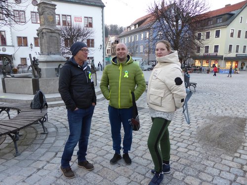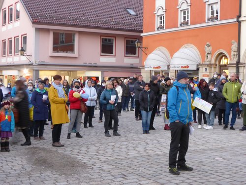 Ganz besonders berührend waren die Erzählungen von Alina und Alex, einem ukrainischen Ehepaar, deren Familien durch den Ausbruch des Krieges betroffen sind und die unmittelbar an den Hilfs- und Sammelaktionen für die Ukraine beteiligt sind. Abgerundet wurde die Mahnwache durch das gemeinsame Singen der Lieder „Wie viele Straßen“ und „Sag mir, wo die Blumen sind“ mit dem ökumenischen Singkreis aus Stein. Das durch die Stadt Immenstadt blau-gelb angestrahlte Alte Rathaus gab dem Ganzen eine eindrucksvolle Kulisse.