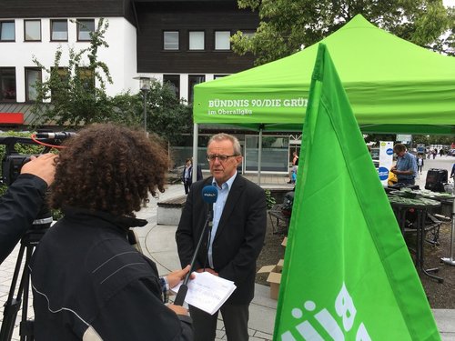 Am Mittwoch, den 28. Juli machte er in Sonthofen Station. Auf dem Spitalpatz stellte er vor ca. 70 Besuchern zusammen mit dem neuen Landesvorsitzenden Thomas von Sarnowski die Ziele der Grünen für die Bundestagswahl vor. Gemeinsam betonten sie die Kompetenz ihrer Partei in Sachen Nachhaltigkeit und Klimaschutz. „Wir stehen vor großen Umbrüchen und wir müssen klimaneutral werden“, so von Sarnowski. Sei es bei der Energiewende oder beim Ausbau des ÖPNV.