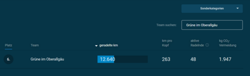 Die Oberallgäuer Grünen haben in diesem Jahr 12.640 km zusammen erradelt und damit 1.947 kg CO2 vermieden. Der Einsatz der 48 Radler*innen hat sich gelohnt, da die Raiffeisenbank Kempten Oberallgäu e.G. auch dieses Jahr pro 3.000 km, die von allen Teams im Oberallgäu zusammen erradelt werden, einen Baumsetzling spendet. Am Ende sind es vier Baumsetzlinge geworden, die das Grüne Team beisteuern kann. "Gerade in diesem Jahr ist jeder Meter, der ohne fossilen Antriebsstoff zurückgelegt wird, wichtiger denn je. Dies ist nicht nur ein wichtiges Zeichen gegen den Klimawandel sondern auch gelebte Solidarität mit der Ukraine", so Kreissprecherin Carolin Schenk.
