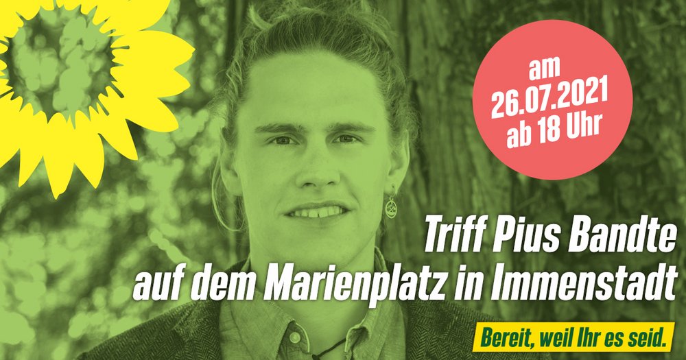 Der Bundestagsdirektkandidat Pius Bandte startet am 26. Juli vormittags in Lindau seine Wahlkampfradtour durch das Allgäu, um sich dem Wahlkreis vorzustellen. Er wird die komplette Strecke auf seinem Fahrrad zurücklegen. Die Radtour soll dazu anregen, die Allgäuer Gemeinden radfreundlicher zu gestalten. Gleichzeitig möchte Pius Bandte die Allgäuer dafür begeistern, mehr auf das Fahrrad umzusteigen. Am Abend des 26. wird er in Immenstadt auf dem Marienplatz eintreffen. Der grüne Ortsverband ist dort ab 17 Uhr mit einem Stand vertreten. Pius Bandte wird zunächst sich und seine Themen für den Bundestagswahlkampf vorstellen. Danach haben Interessierte die Möglichkeit, Pius Bandte Fragen zu stellen und ihn im persönlichen Gespräch kennenzulernen. Alle Bürgerinnen und Bürger sind herzlich dazu eingeladen.