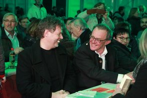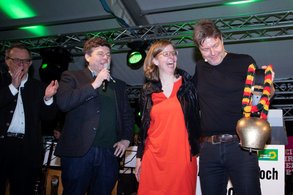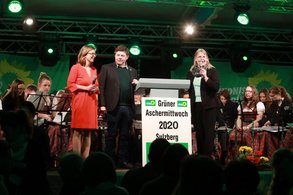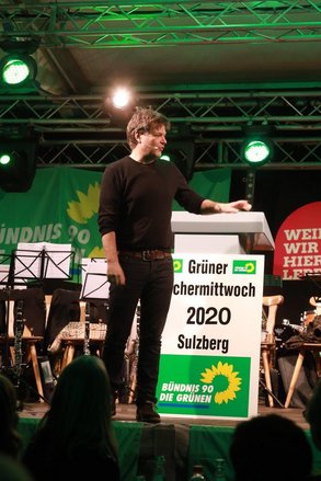 Thomas Gehring, Landtagsvizepräsident, unterhielt mit einer Rede in echtem Allgäuer Dialekt und schlug den Kurs von der Kommunal- bis zur Landtagspolitik. Er wies beispielsweise darauf hin, dass es für Alfons Hörmann schwierig werden könnte beide Hüte, Landrat und DOSB-Präsidentschaft, zu tragen - so "Großkopfad" könne man fast nicht sein. Die Grüne Landratskandidatin Christina Mader, die zu Beginn der Veranstaltung zu Wort kam und ihre Motivation für die Kandidatur darin sieht, dass ihre Kinder in einem weltoffenen und toleranten Allgäu aufwachsen, würde sich Ihrer Tätigkeit stattdessen in Vollzeit und voller Kraft widmen. Der CSU empfahl Thomas Gehring das Grüne Programm nicht nur zu kopieren, sondern auch zu kapieren – das heißt, was gerade aktuell hinsichtlich Klimaschutz in den Wahlprogrammen geäußert wird, dann auch in die Tat umzusetzen. So solle der erklärte Bienenfreund Markus Söder zeigen, was er konkret zum Artenschutz beitragen kann. Generell sei Söders Werteorientierung nicht ganz klar; was aber sicher sei, dass bei ihm die Umfragewerte höchste Relevanz besitzen, so Thomas Gehring. Mit tosendem Applaus wurde anschließend Robert Habeck auf der Bühne begrüßt. Die Festzeltatmosphäre sei etwas ganz Besonderes, so der Bundesvorsitzende. Da träfen die unterschiedlichsten Menschen aufeinander, alt und jung, Landwirt und Ingenieur. Das böte Chancen für einen echten Austausch, für gemeinsame Erfahrungen und für gelebte Demokratie. Gerade in Zeiten von rechter Hetze im Netz, die häufig zu echter Gewalt auf den Straßen führt, was sich bei dem Attentat von Hanau gezeigt hat. Das gerade Kommunalpolitiker – auch unterschiedlichster Parteien – mit scharfen verbalen, aber auch körperlichen Angriffen zu rechnen haben sei traurige Realität geworden. „Kommunalpolitik ist das Heldenfeld und die Essenz der Demokratie“, so Robert Habeck, deshalb sei es wichtig sich vor Ort zu engagieren. „Wer gehört werden will, muss selbst zuhören“; auch diesen Leitsatz hält er für den Fortbestand unserer Demokratie als unabdingbar. Zum Thema Landwirtschaft äußerte der Grünenvorsitzende Verständnis für die demonstrierenden Landwirte; es sei wichtig, eben nicht mit dem Finger auf die Bauern zu zeigen, sondern gemeinsam mit Ihnen Möglichkeiten zu entwickeln. „Es muss ökonomisch sinnvoll sein, nachhaltig und im Sinne des Tierwohls zu produzieren“. Dazu gehörten beispielsweise faire Preise für Lebensmittel.