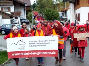 An der "Roten Linie" am Grünten nahmen auch Teilnehmer des Kreisvorstandes teil. Ca. 1100 Bürger*innen - fast alle rot gekleidet - spazierten vom Parkplatz bis zur Lifttrasse um gegen die Vermarktung des "Wächter des Allgäus" zu demonstrieren. Für Christina Mader, die den Zug mit anführte, war es "beeindruckend, dass sich so viele Allgäuer schützend vor den Wächter des Allgäus gestellt haben". "Die "rote Linie" war ein klares Zeichen an die Investoren, den Grünten nicht einem Eventtourismus zu opfern", fordert die Kreissprecherin ein Umdenken bei den Planungen.