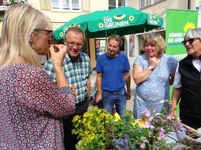 Sonthofen. Das Insektensterben ist längst auch in den privaten Gärten zum Thema geworden. Entsprechend groß war der Andrang am vergangenen Samstag beim Bieneninformationsstand der Sonthofener Grünen. Bei strahlendem Sonnenschein lockten die essbaren Blüten am Stand nicht nur Bienen und Schmetterlinge sondern auch interessierte Sonthofer Gärtner. Gerti Epple, Wildkräuterfrau und Vorsitzende des Allgäuer Kräuterland e.V. stand den Gästen für Fragen und mit vielen Informationen zur Seite. Sie regte aber auch dazu an die einheimischen Pflanzen einmal selbst zu probieren. Die Allgäuer Fauna sei nicht nur für die Artenvielfalt der Insekten, sondern auch für unsere eigene Gesundheit wertvoll und wichtig, erklärte Epple. Neben den Blüten verteilte der Landtagsabgeordnete Thomas Gehring auch sogenannte "Seedbombs". Saatkugeln, die direkt im eigenen Garten oder auf einer Wiese verteilt werden können. Mit diesen Saatkugeln kann man vollkommen unkompliziert schon vor der Haustür etwas gegen das Artensterben tun. "Einheimische Pflanzen locken Nützlinge und bieten ihnen Nahrung", erklärte Gehring. Mit zahlreichen Tipps und Tricks konnten die Wildkräuterfrau und der Landtagsabgeordnete viele Sonthofer darin bestärken und überzeugen, dass der Artenschutz auch im eigenen Garten anfängt.