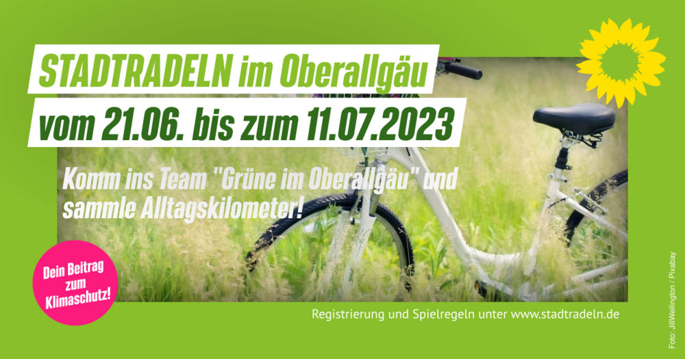 Wir machen wieder mit beim STADTRADELN: vom 21. Juni bis zum 11. Juli 2023 im Team "Grüne im Oberallgäu". Letztes Jahr haben wir den dritten Platz erreicht und gemeinsam 4 Weißtannen erradelt. Das wollen wir dieses Jahr wieder schaffen mit dir und den Unterteams unserer Ortsverbände! Melde dich an unter: STADTRADELN - Registrieren . Dort findest du auch die Spielregeln.